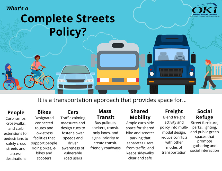 Specifically, the policy’s goal is to improve the transportation network so that more streets and roads in the OKI Region meet this definition, and to encourage future designs which accommodate all users.